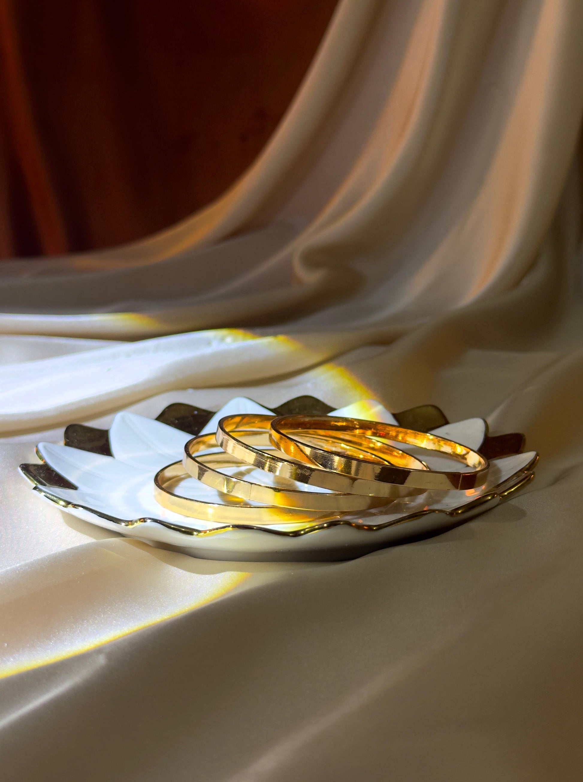 Timeless and elegant, these sleek gold-plated bangles are designed for everyday sophistication. Their minimalist shine makes them perfect to wear solo for a chic look or stacked for a bold statement. A versatile essential for both casual and festive occasions.