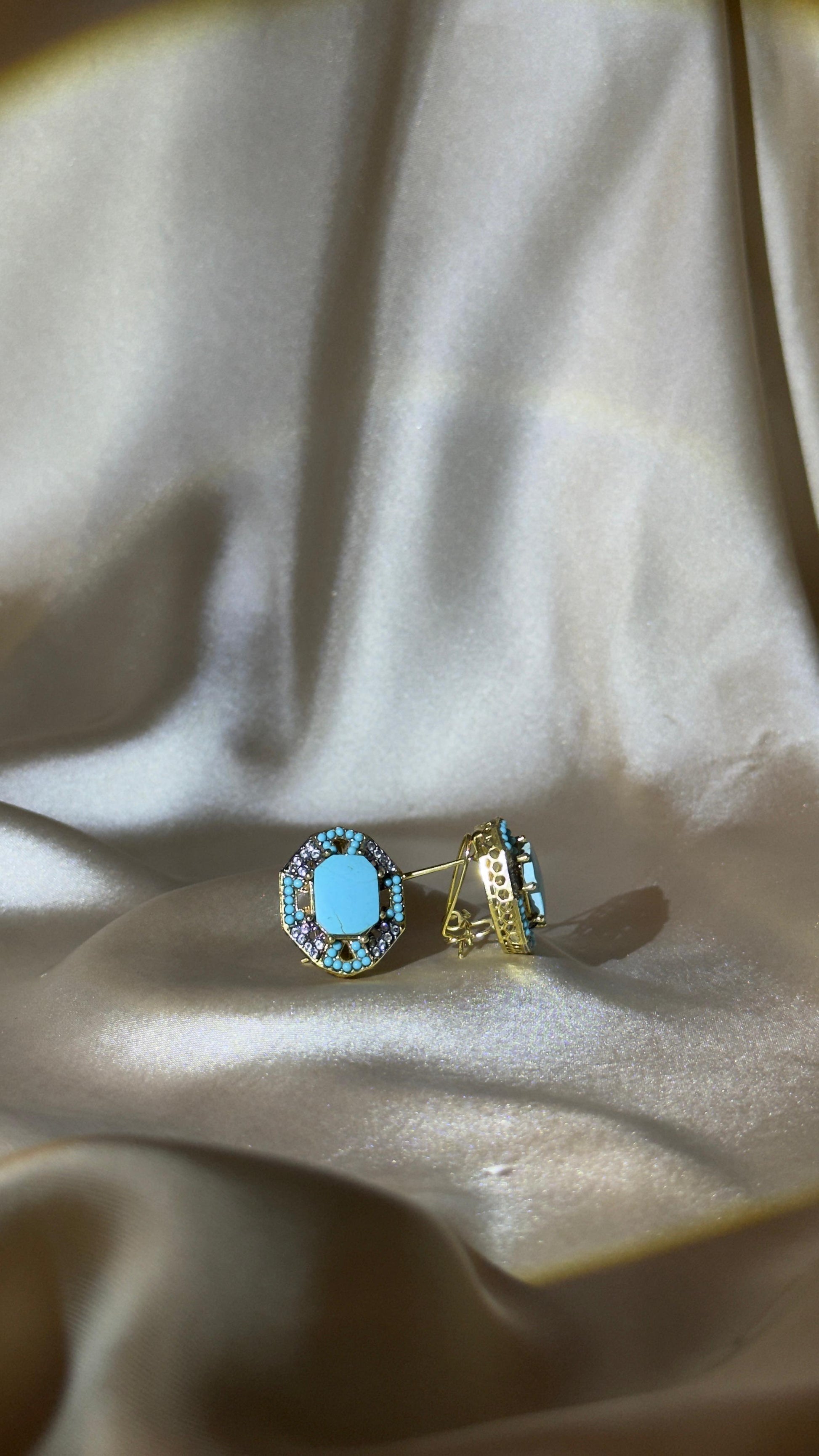 Beautiful turquoise studs with a golden touch, surrounded by sparkling stones. Perfect to add a pop of color and elegance to any outfit.