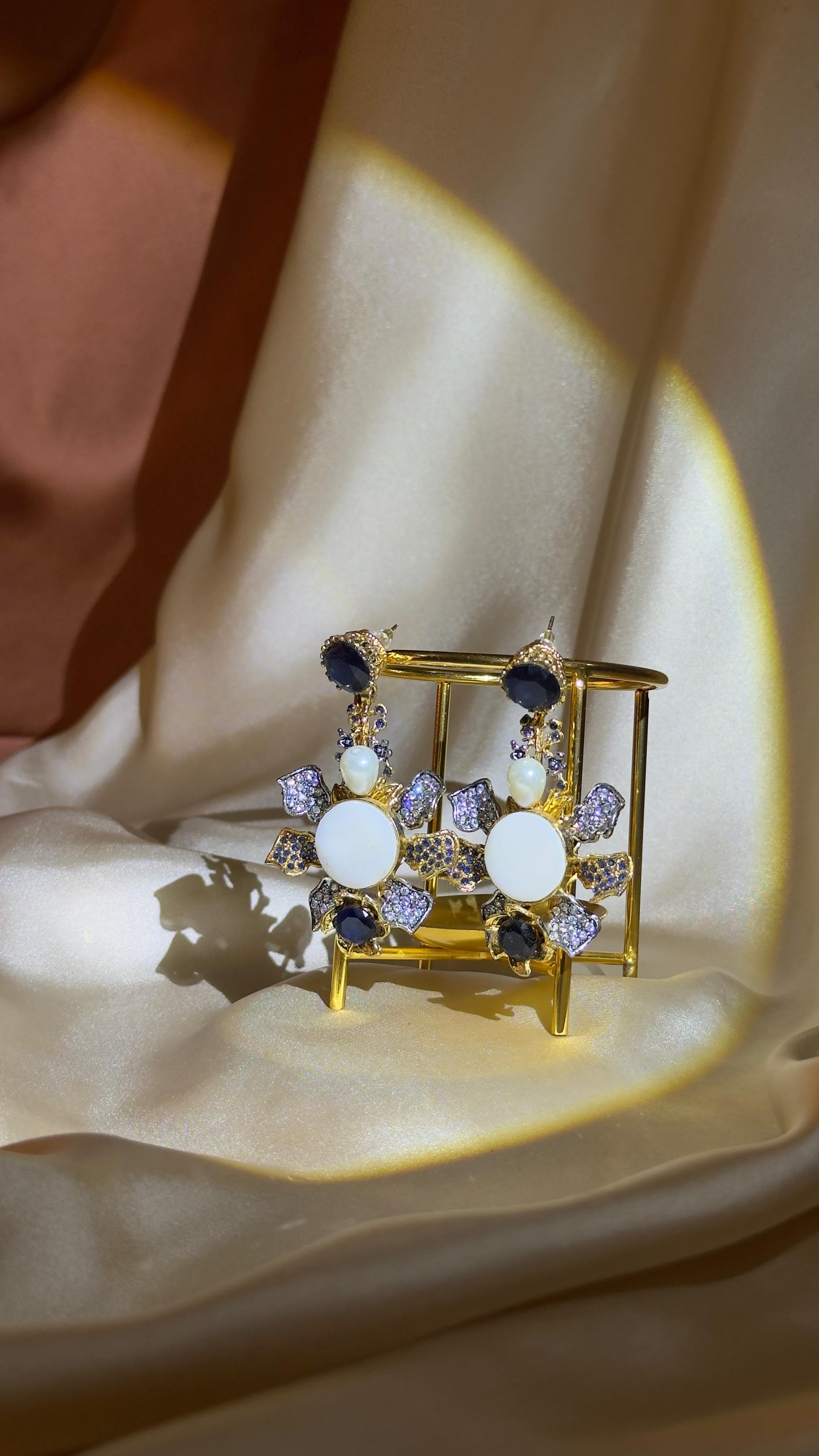 Dazzling earrings with navy blue stones, white accents, and pearl details, arranged in a starburst floral design. A striking pair that blends elegance with bold charm.