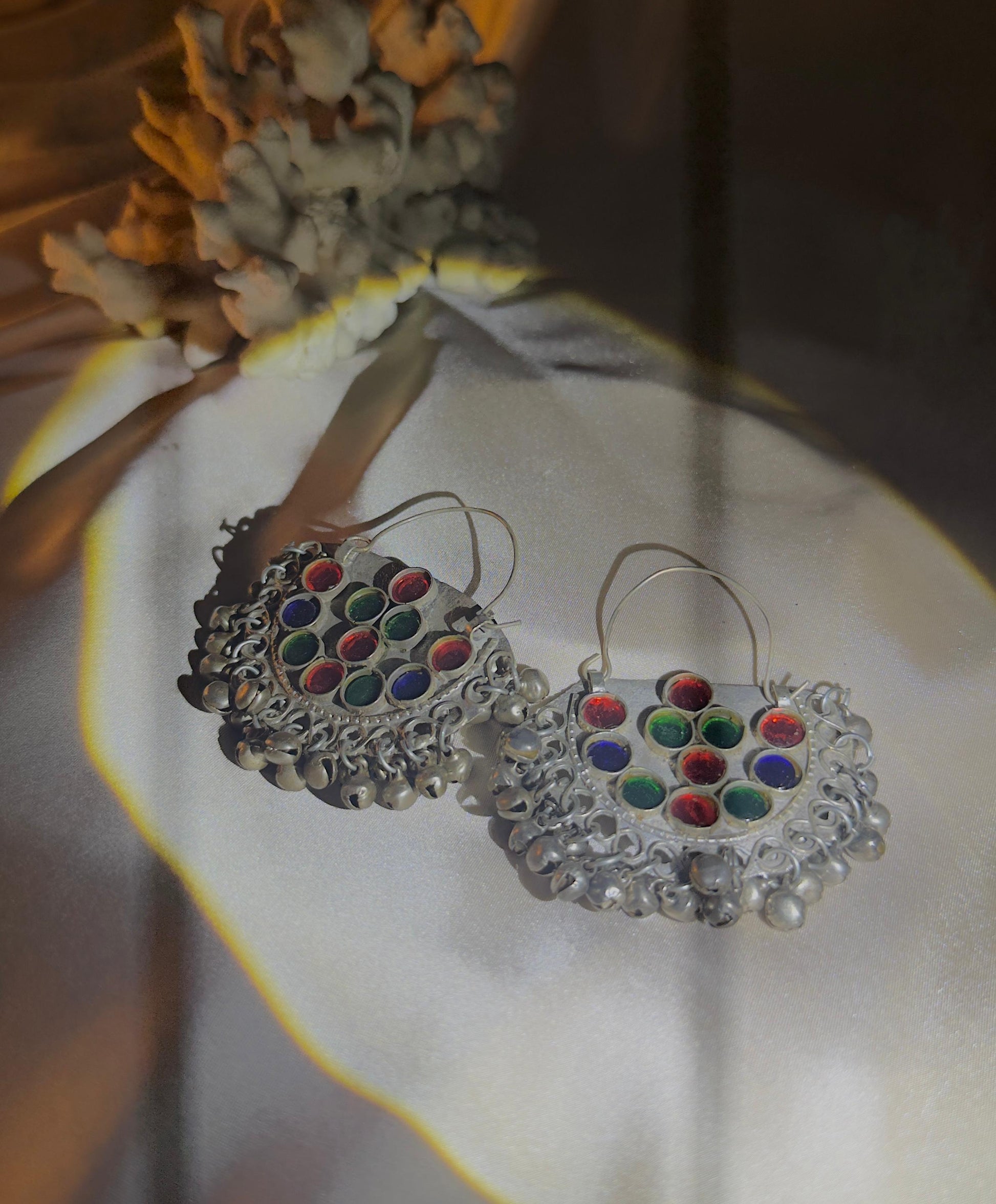 Crafted in antique silver-tone metal, Noorani Phool earrings blend vintage tribal charm with a burst of vibrant color. The crescent-shaped base is adorned with tiny ghungroo details, while the center blooms with multicolored glass inlays in rich hues of red, green, and blue — reminiscent of a radiant flower in full bloom. These earrings are perfect for those who love to add a bold, artistic twist to their ethnic or boho look. Whether paired with a saree or a breezy kurta, they bring stories of tradition and timelessness to life.