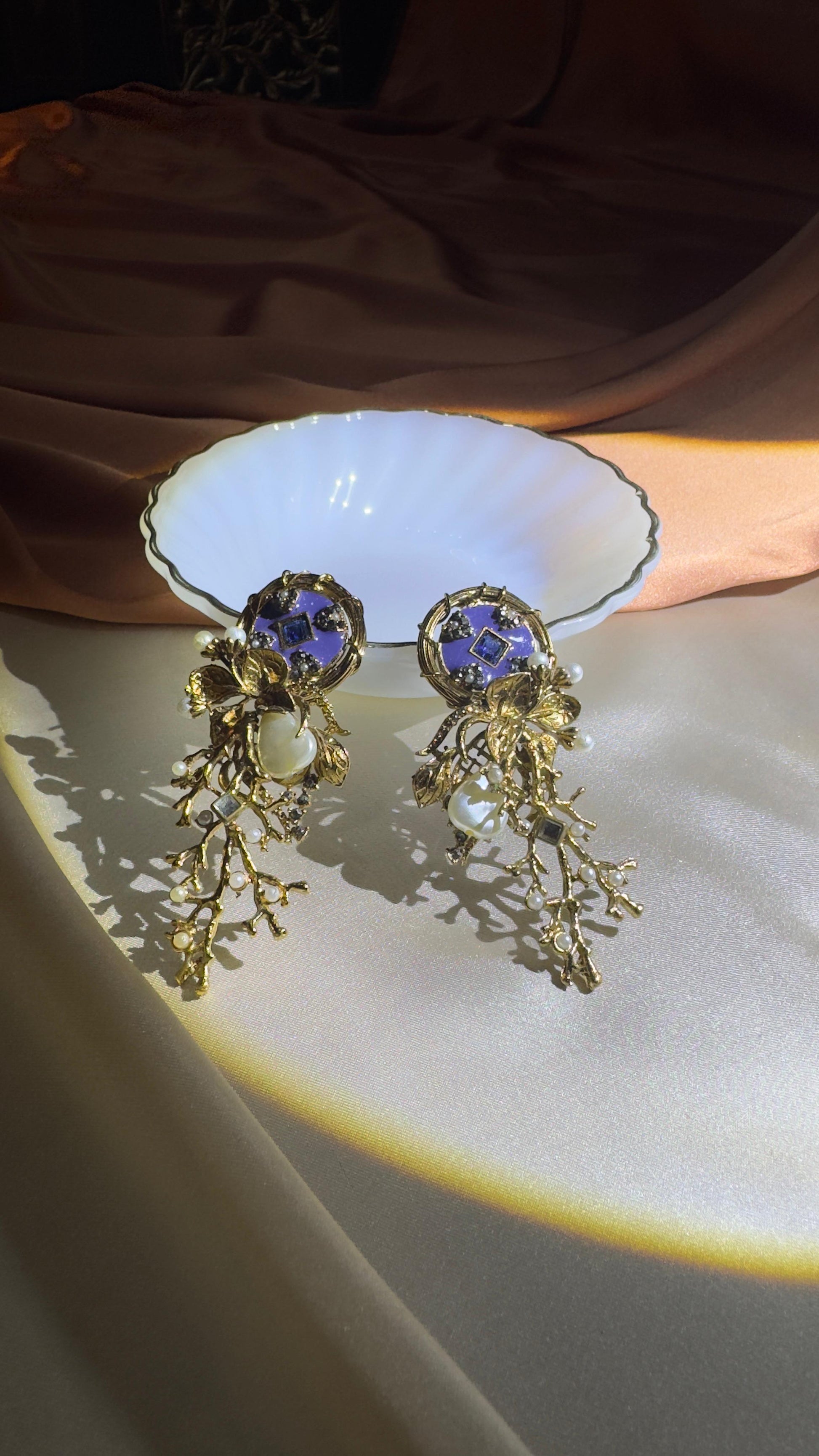 A statement pair featuring deep blue stones, golden floral vines, and delicate pearl drops. These earrings bring a touch of regal charm and elegance, perfect for weddings, festive wear, or any occasion where you want to shine.