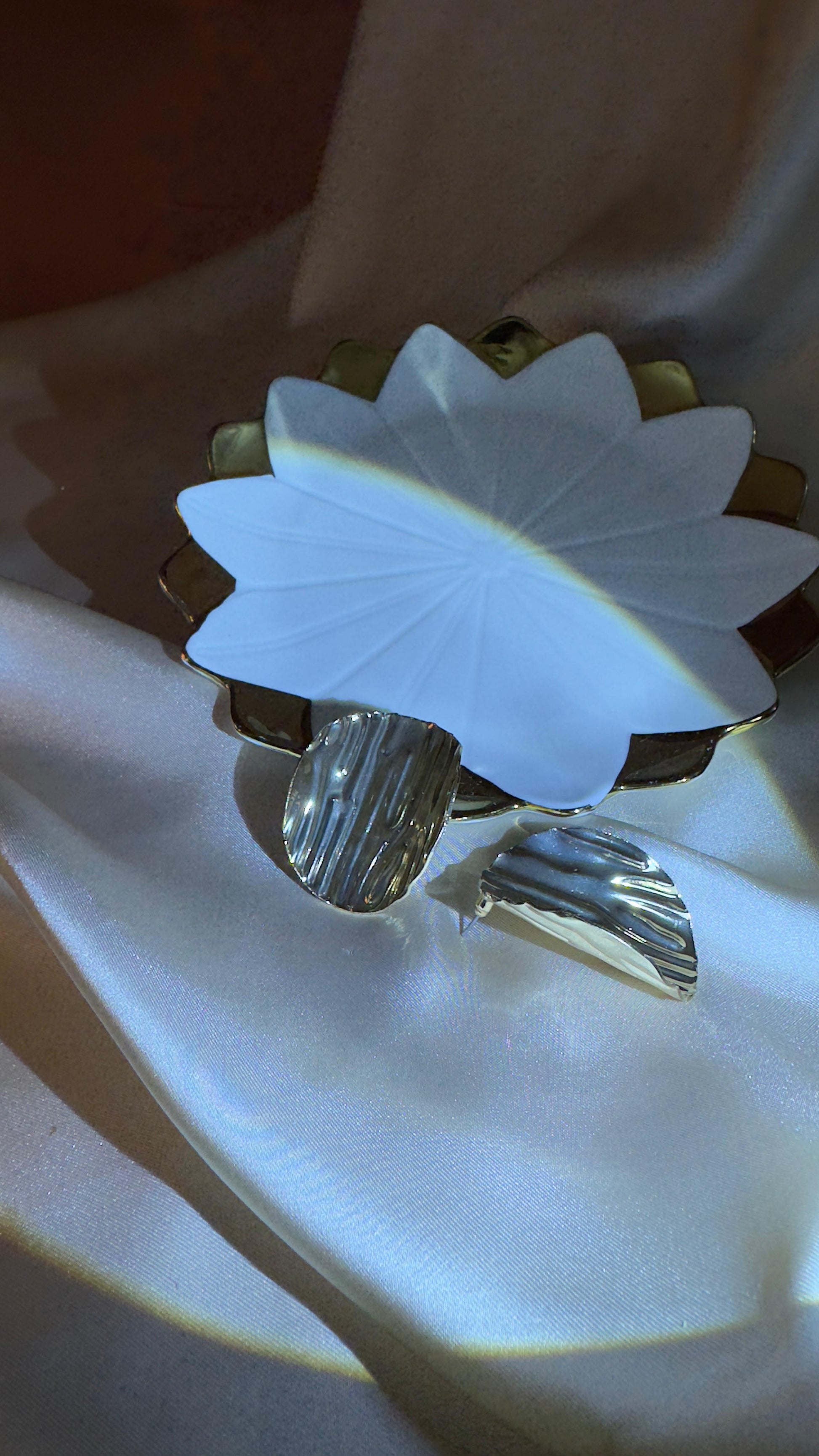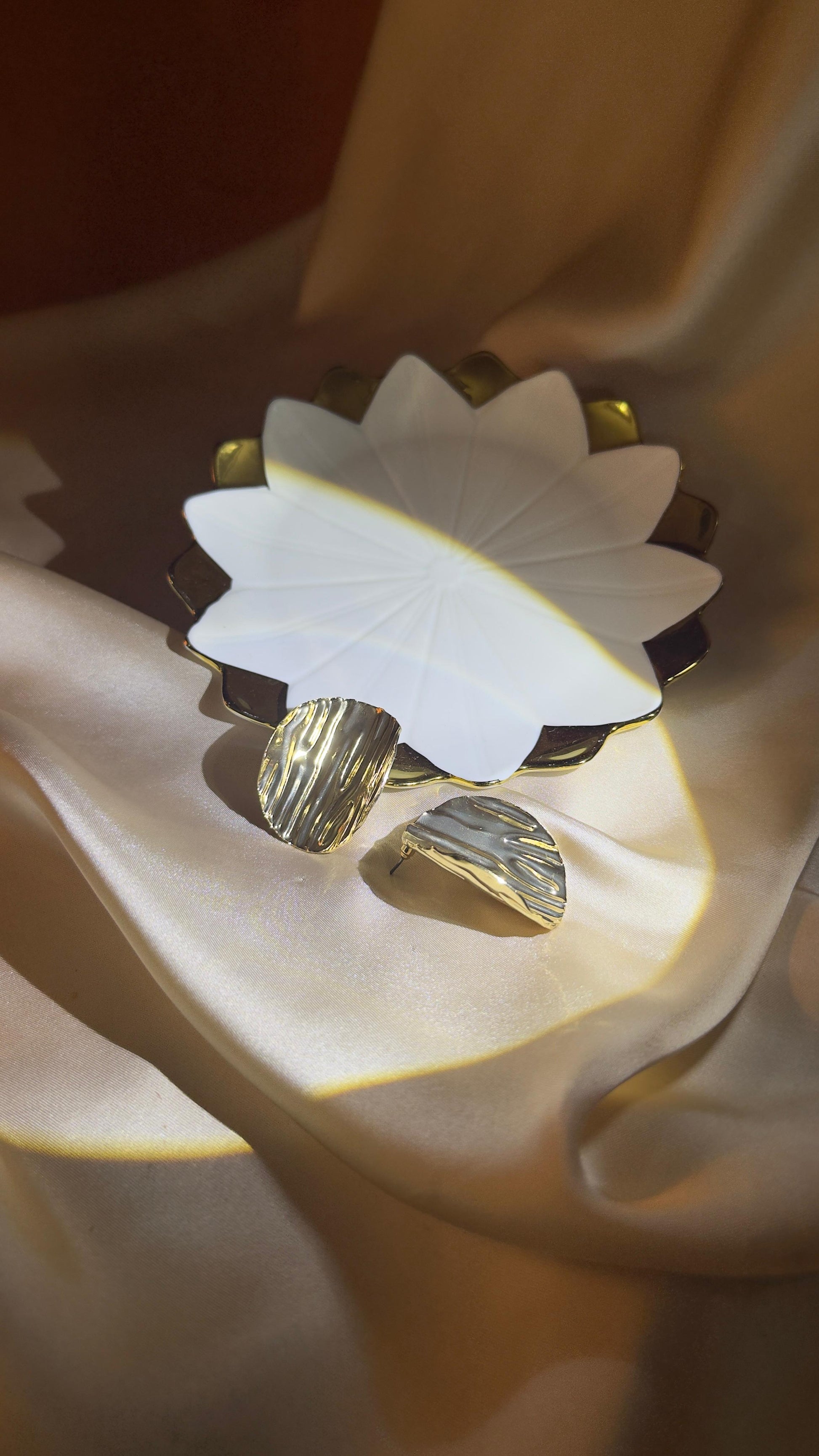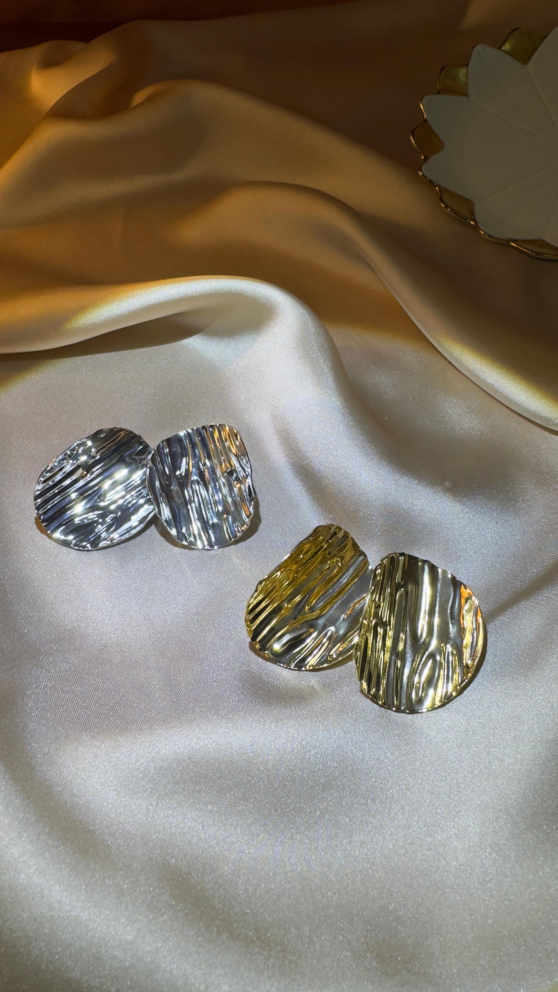 Bold textured metal studs in gold and silver tones, designed with a wave-like finish that reflects light beautifully. A minimal yet striking piece for everyday chic and evening glam.